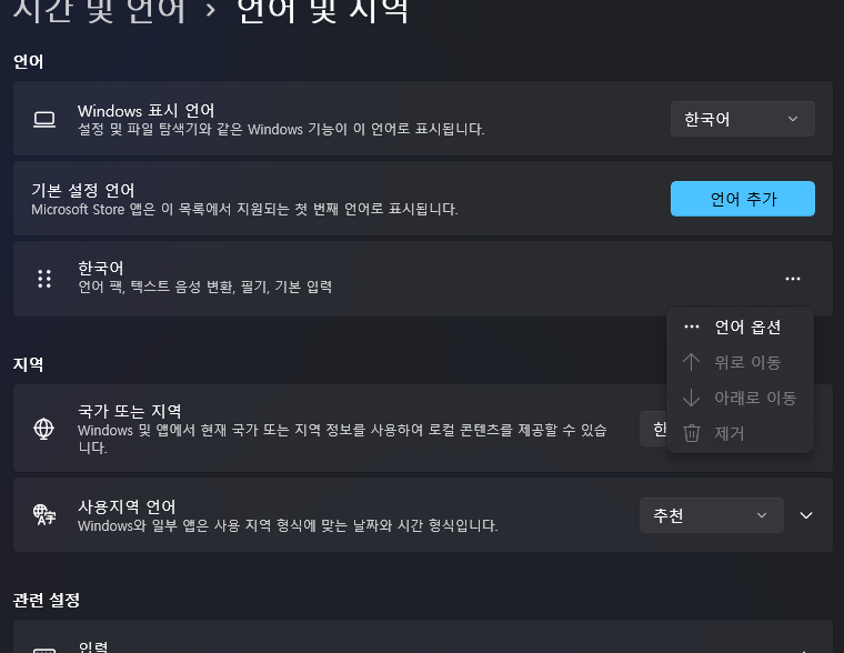 3.1.2 언어 - 한국어 - 오른쪽 ... - 언어 옵션