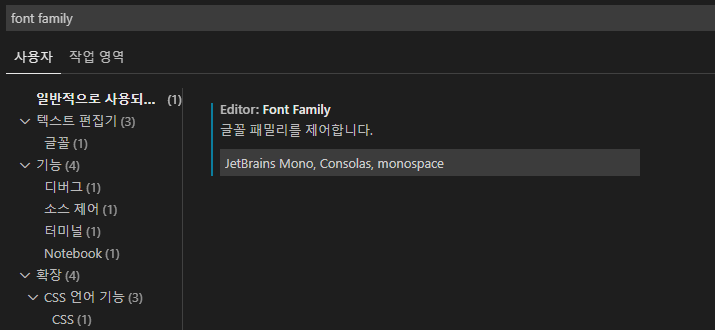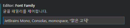 vscode를 한글로 적용한 경우 설정창 진입은 '파일 - 기본 설정 - 설정' 순이며, 단축키는 'Ctrl + ,' 이다.
