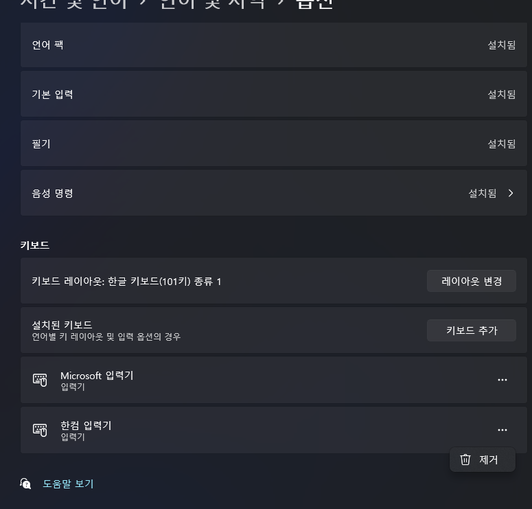 3.1.3 키보드 - 한컴 입력기 - 오른쪽 ... - 제거