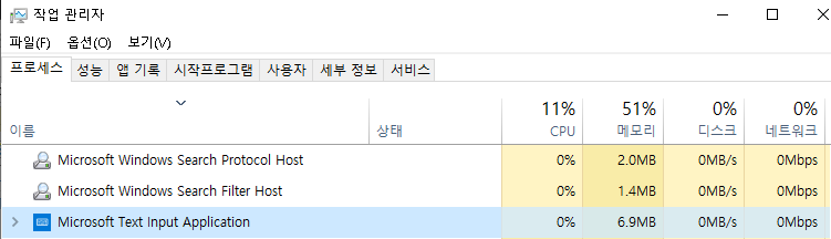 2. Microsoft Text Input Application 이라고 되어 있는 프로세를 찾아서 우클릭 후 작업끝내기(E) 를 선택해서 종료한다.