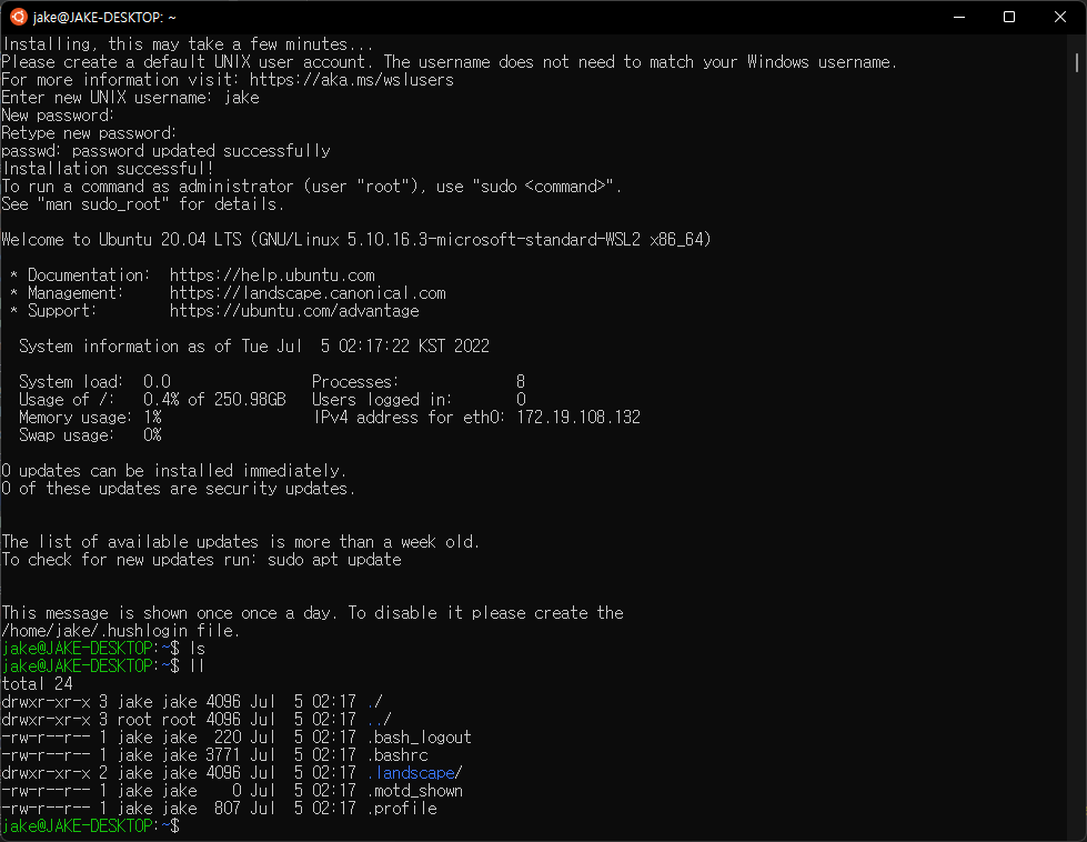 여기서 설치가 완료된다면 드디어 windows terminal에서도 wsl이 정상작동한다.