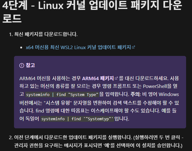 위 링크에 들어가서 'x64 머신용 최신 WSL2 Linux 커널 업데이트 패키지' 를 클릭하면 .msi 파일을 받을 수 있다.