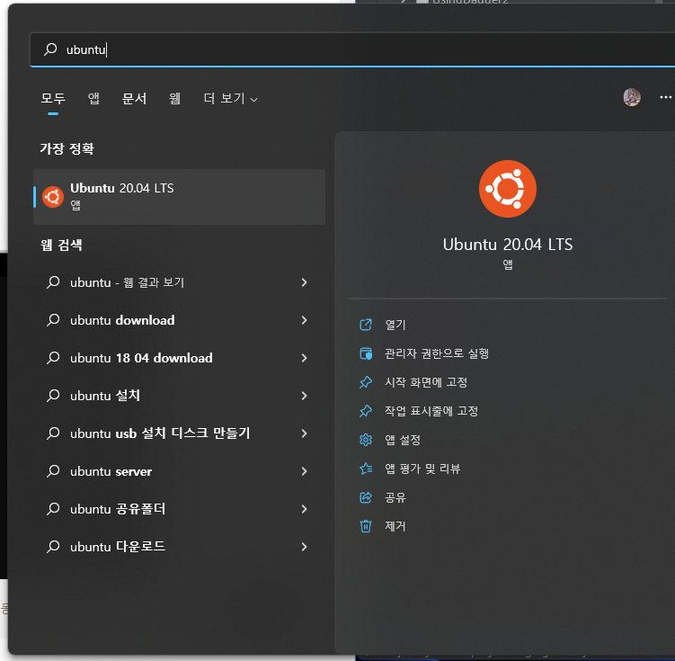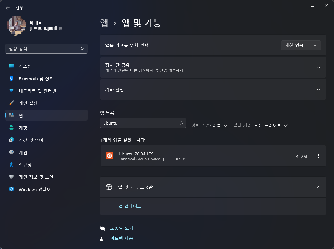 설정 - 앱 - 앱 및 기능 - 앱 목록 에서 ubuntu를 검색하면 다음과 같이 검색된다.