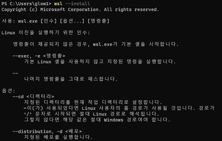 wsl을 설치하는 명령을 수행하라는 포스팅을 보고 다음과 같이 수행했다.