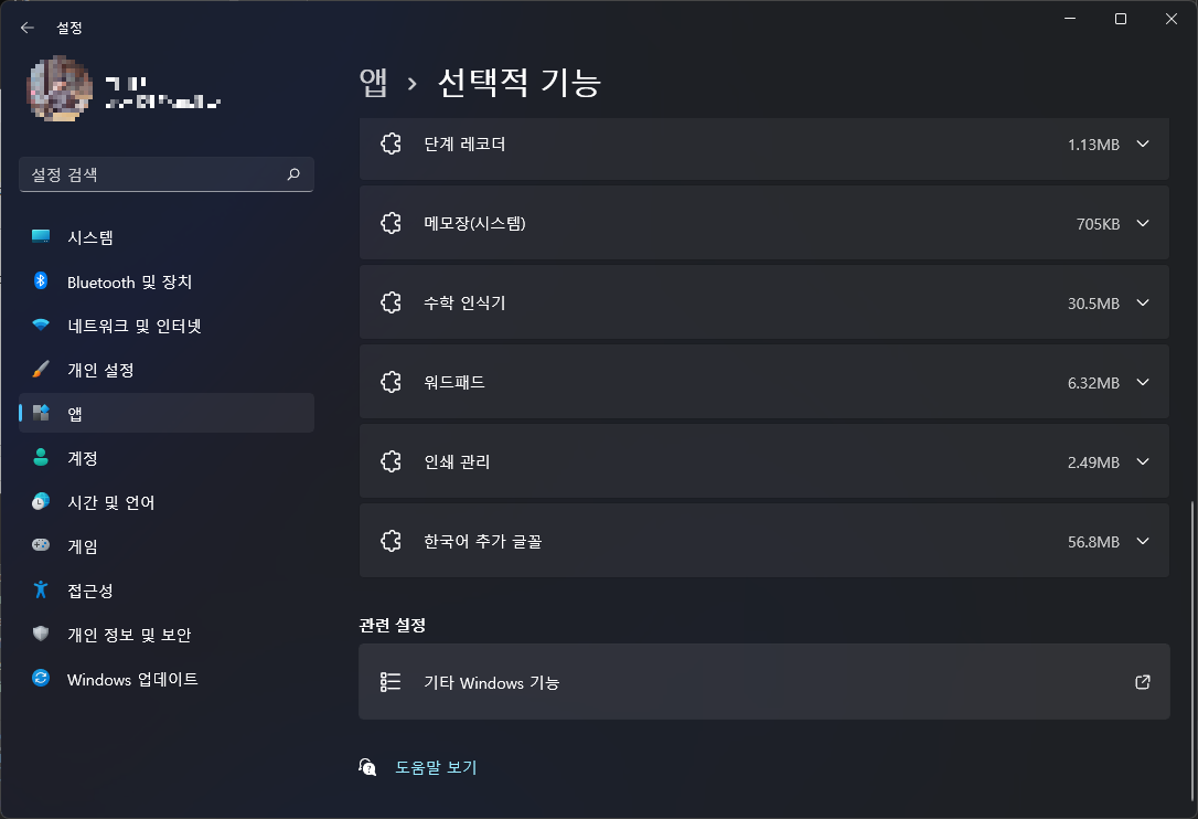 설정 - 앱 - 선택적 기능 - 맨 아래 '기타 Windows 기능'