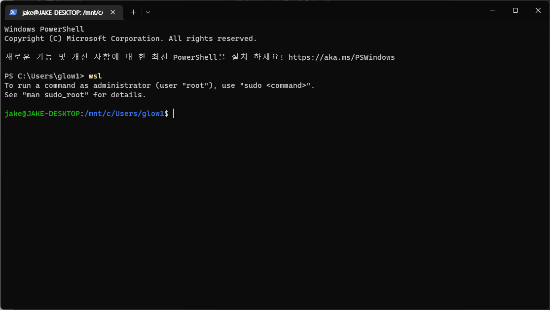 위 1.의 순서대로 다시 wsl을 설치한다. 설치 후 wsl을 수행한다.